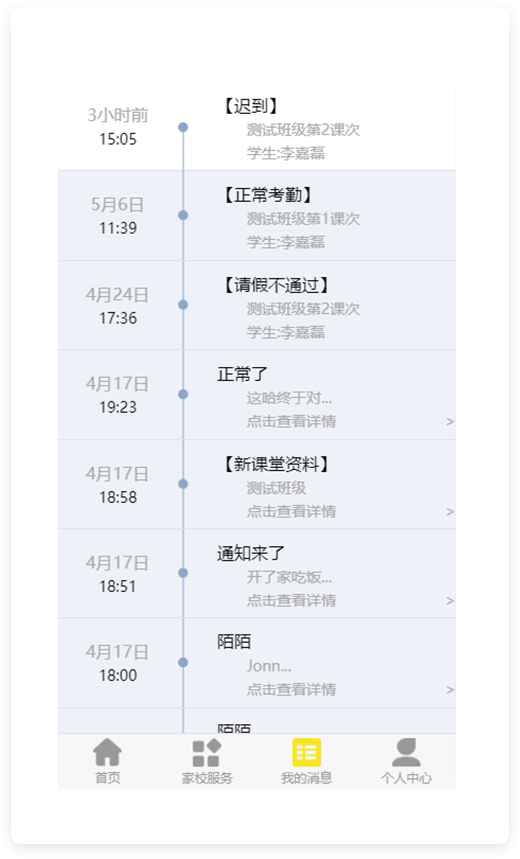当任课教师给孩子打了考勤信息后,家长会在消息中心收到孩子的考勤信息。若孩子持卡刷卡到离校之后家长会收到孩子到离校的微信通知。通知消息也包括了这些请求的回复