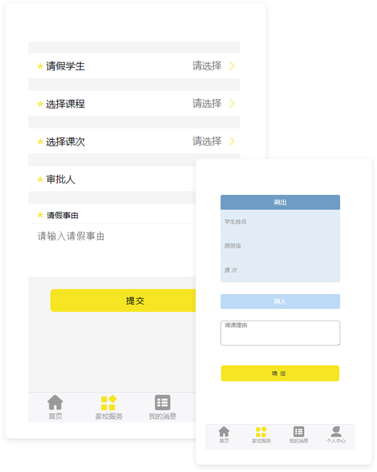 在家校服务中可调课功能家长自行选择调入班级即可,请假填写时间与原由即可。点击确定即可发送至任课教师,等待教师审批