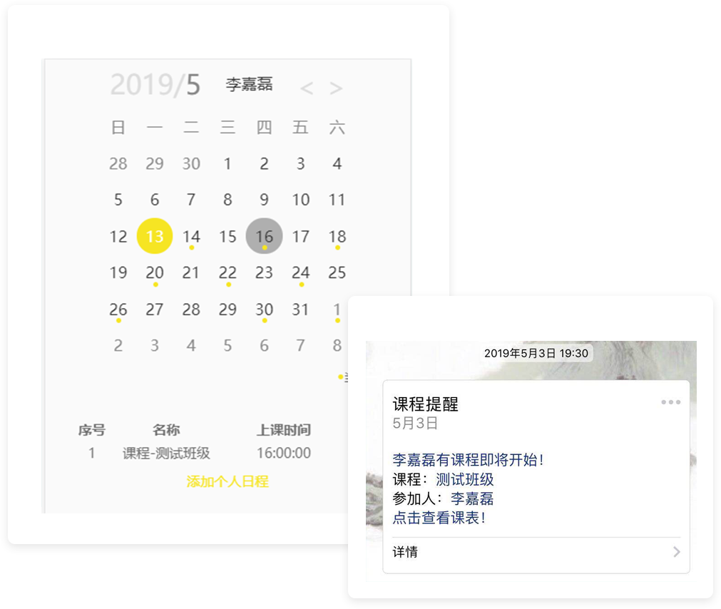 以日历直观的信息查看孩子每日课程信息,用黄点做标记,若第二天有课会有微信提示家长